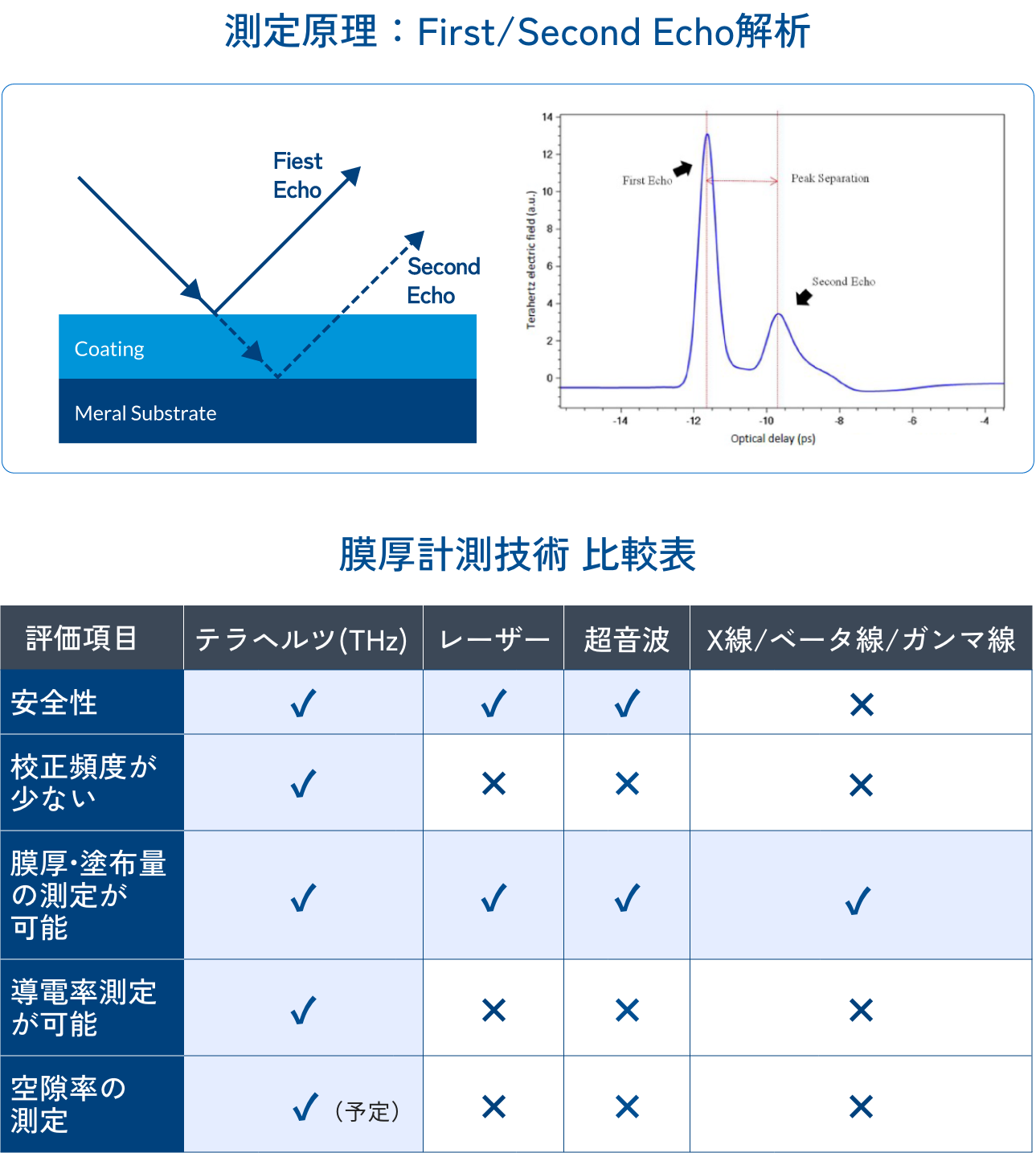 テラヘルツ膜厚計は、物質を透過するテラヘルツ波の反射時間差を解析することで、膜厚・密度・塗布量・導電性など複数のパラメーターを非接触で同時に測定する装置です。放射線を使用しないため安全性が高く、測定はリアルタイムで行われるため迅速な全数検査が可能です。また、サンプルを破壊せずに測定できるため、研究開発から量産工程まで、品質評価とプロセス管理を同時に実現します。